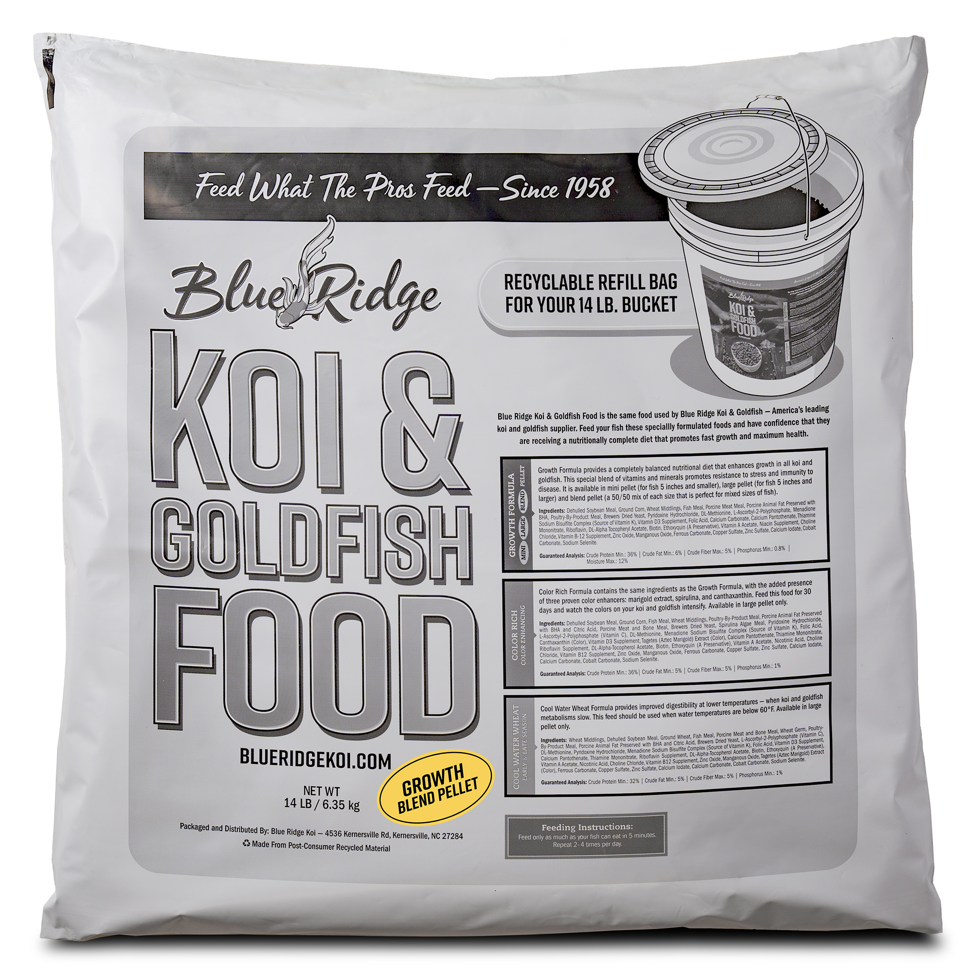 Blue Ridge Blend Growth Formula Koi and Goldfish Food is perfect for mixed sizes of koi and goldfish. This food provides a completely balanced nutritional diet that greatly enhances growth in all koi and goldfish. Contains a special blend of vitamins and minerals that promotes resistance to stress and immunity to disease.