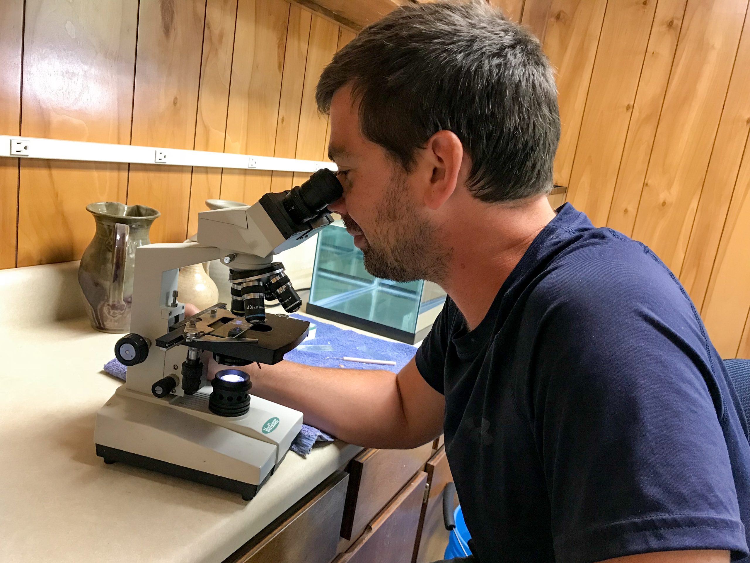IMG_4421 Published August 13, 2018 at 2560 × 1920 in Health & Bio-Security Third-generation koi farmer Josh LeFever examines a sample by microscope. ← Previous Next →